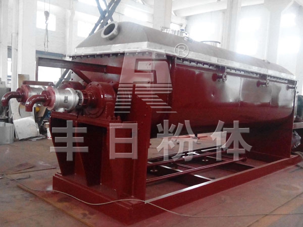 空心轴上密集排列着楔型中空浆叶,热介质经空心轴流经浆叶。单位有效容积内传热面积很大,热介质温度从-40℃到320℃,可以是水蒸汽,也可以是液体型:如热水、导热油等。间接传导加热,没有携带空气带走热量,热量均用来加热物料。热量损失仅为通过器体保温层向环境的散热。楔型浆叶传热面具有自清洁功能。物料颗粒与楔型面的相对运动产生洗刷作用,能够洗刷掉楔型面上附着物料,使运转中一直保持着清洁的传热面。浆叶干燥机的壳体为Ω型,壳体内一般安排二到四根空心搅拌轴。壳体有密封端盖与上盖,防止物料粉尘外泄而充分发挥作用。