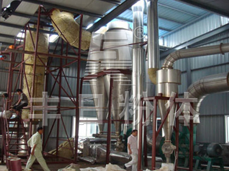空气经过过滤和加热,进入干燥器顶部空气分配器,热空气呈螺旋状均匀地进入干燥室。料液经塔体顶部的高速离心雾化器(旋转)喷雾成极细微的雾状液珠,与热空气并流接触,在极短的时间内可干燥为成品。成品连续地由干燥塔底部和旋风分离器中输出,废气由风机排空。